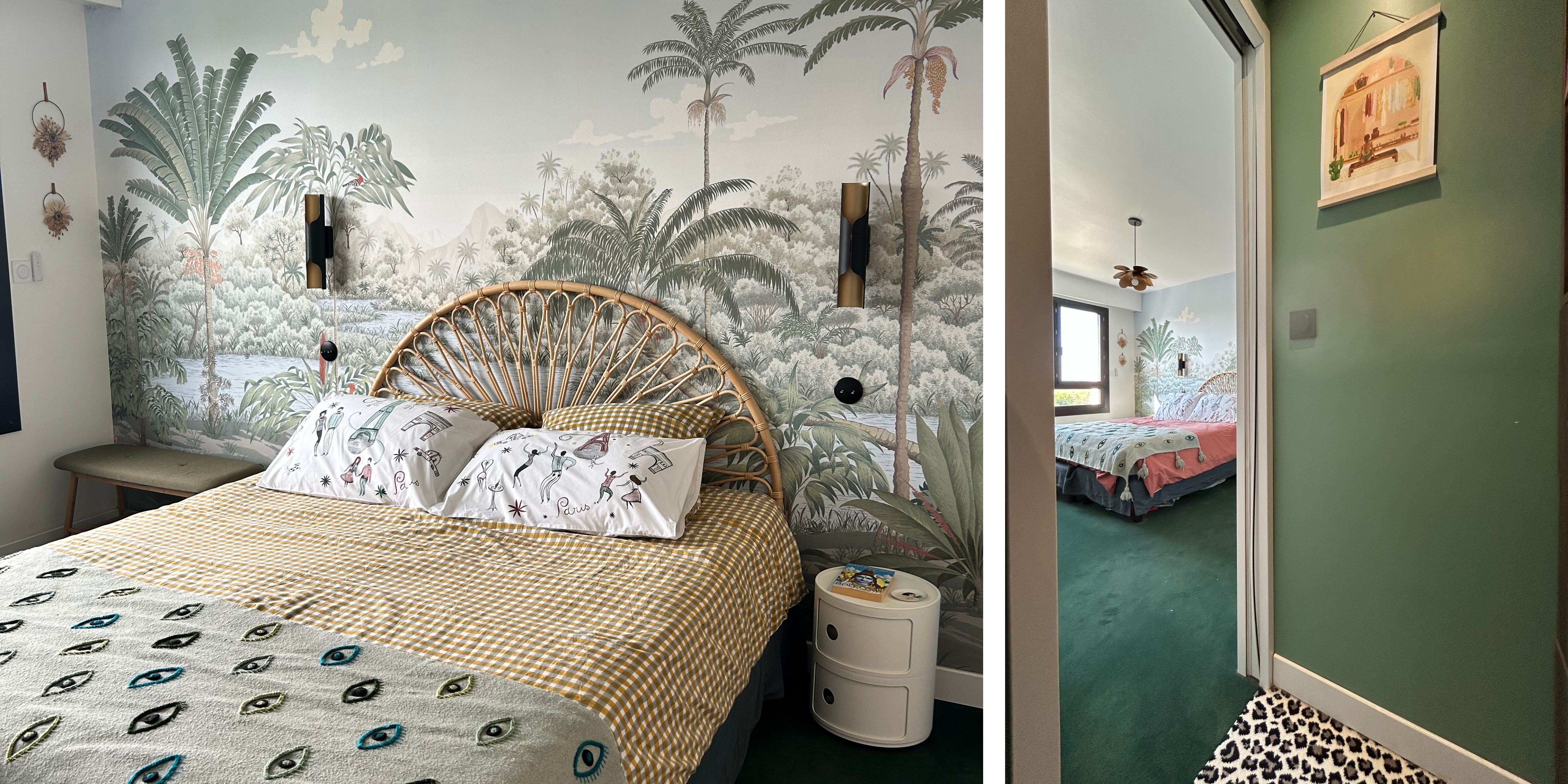 Le papier peint panoramique impose la palette de la chambre et rythme l’espace par ses motifs poétiques et ses teintes rappelant la nature. La moquette verte reprend l’une des couleurs du papier peint pour créer une atmosphère élégante et enveloppante. Le dressing s’aligne sur cette couleur, prolongeant l’univers de la chambre, tandis que la salle de bain attenante adopte quelques nuances terracotta pour un clin d’œil subtil aux motifs du papier peint. La touche finale : une moquette léopard apporte contraste et caractère.