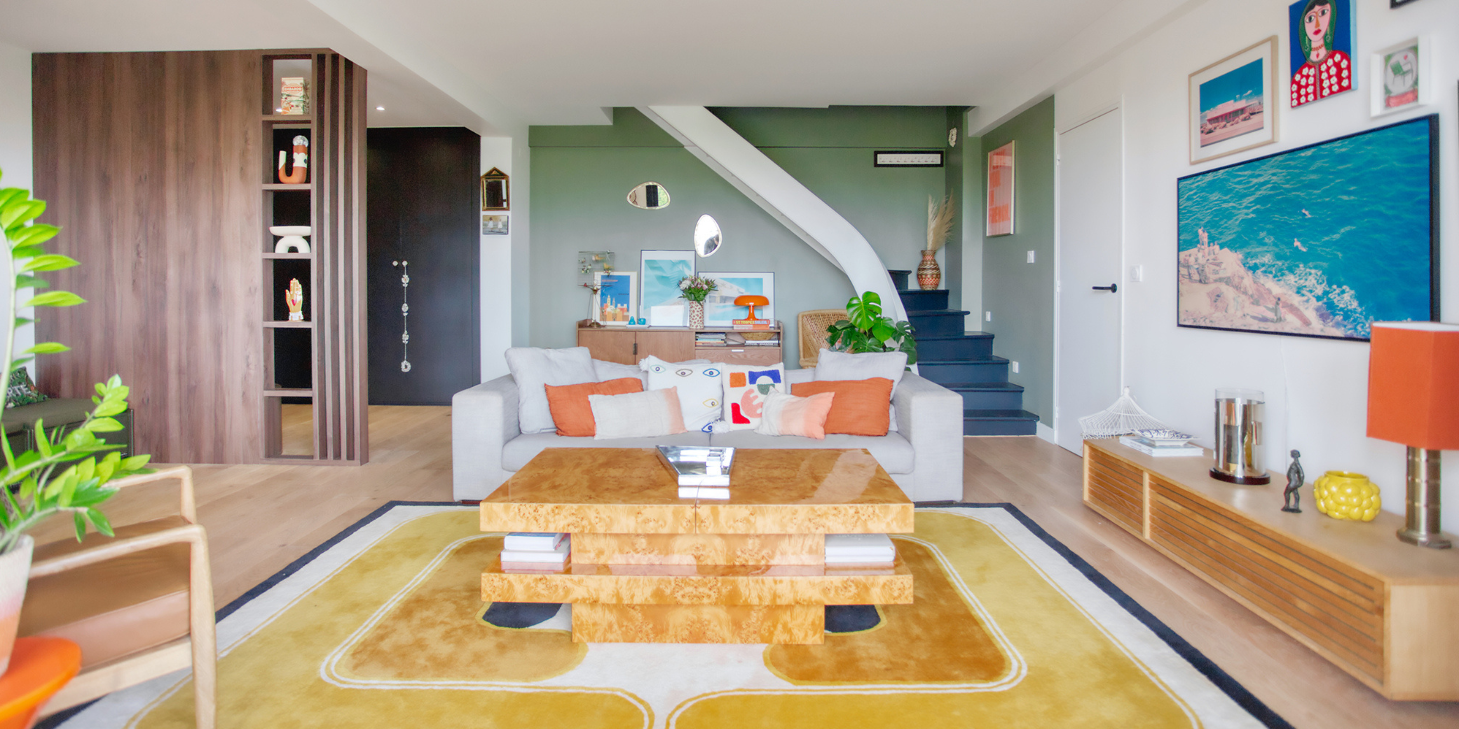 Le salon s’inspire de l’univers seventies avec un mur vert kaki qui structure l’espace et sert de base a une palette dynamique. Les accessoires et éléments décoratifs, en particulier les touches d’orange, apportent rythme et gaieté, créant un intérieur vivant et colore. La couleur devient le fil conducteur, donnant au salon une personnalité affirmée tout en restant en harmonie avec le reste du projet.